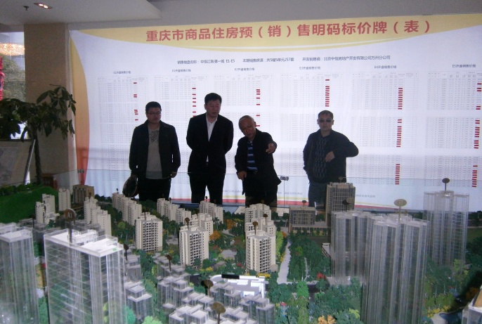 在“江南第一城“销售中心,雷院长详细询问楼盘结构和重庆市场的销售以及对已完工程交付使用情况。