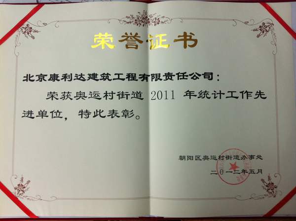 5月24日,奥运村街道办事处召开2012年统计工作会议,会上对统计工作表现出色的单位和个人进行了表彰,我公司喜获“奥运街道2011年统计工作先进单位”荣誉证书。奥运村地区有纳入统计考核企业近800家,此次有30家获得2011年统计工作先进单位荣誉。
