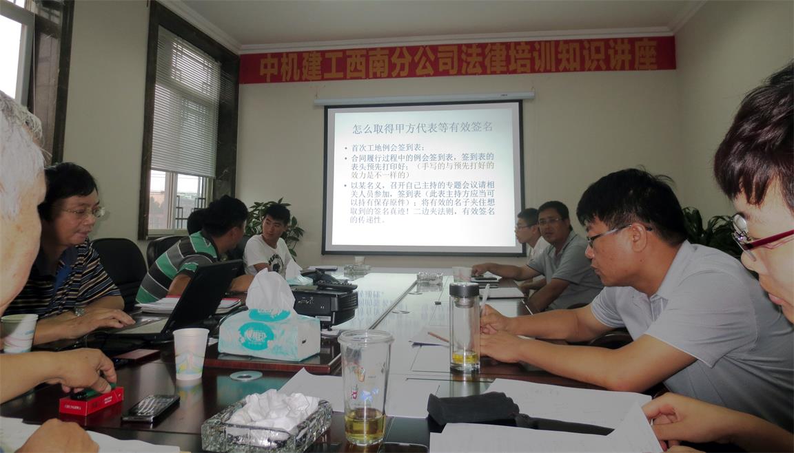 为提高企业工程管理人员的法律防范意识防范意识,规避项目管理中的法律风险,提升项目综合管理能力,2013年6月28日至6月30日,中机建工西南分公司“工程建设领域合同管理与法律风险防范及控制实务”的法律知识讲座在成都中机建工西南分公司举行,由公司法律顾问、北京市正皓律师事务所贺亦红律师主讲,中机建工西南分公司及下属两个项目部全体成员参与培训。
