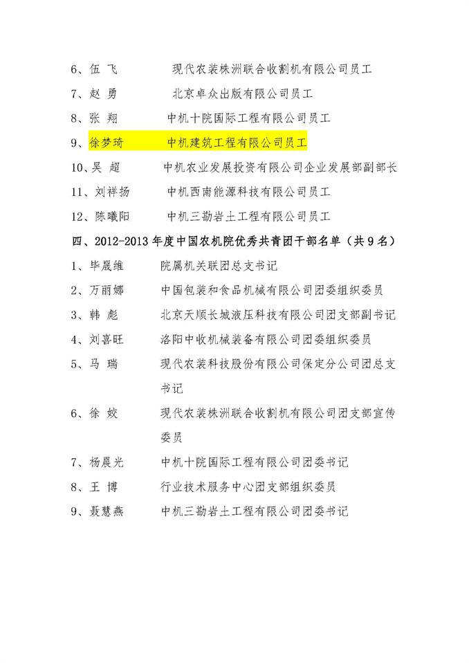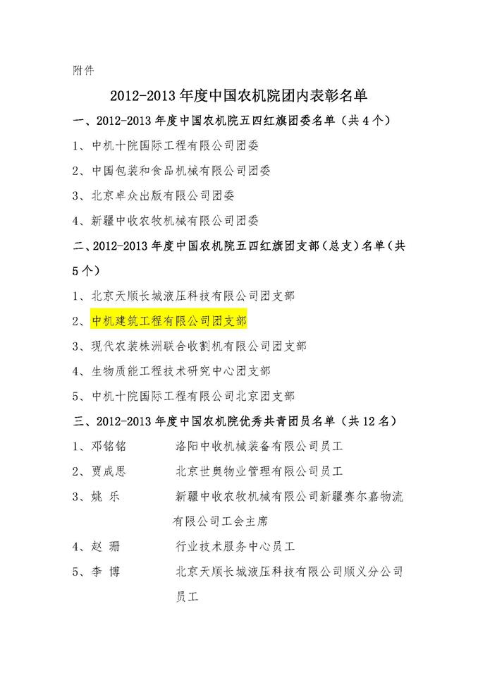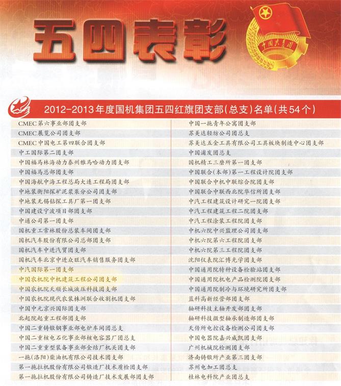 经过各级团组织的严格评审,中机建工团支部获2012-2013年度国机集团五四红旗团支部、中国农机院五四红旗团支部称号,石家庄分公司徐梦琦同志获2012-2013年度中国农机院优秀共青团员称号。
