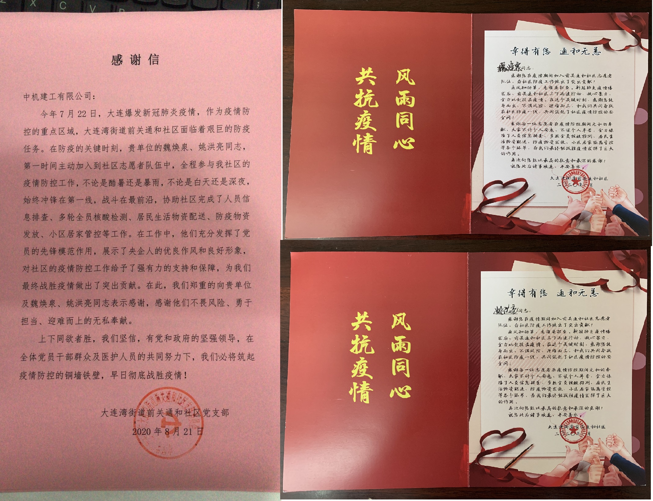 “感谢他们不畏风险、勇于担当、迎难而上的无私奉献。”这是一封在疫情后由大连市大连湾街道前关通和社区党支部寄往中机建工感谢信中的内容。