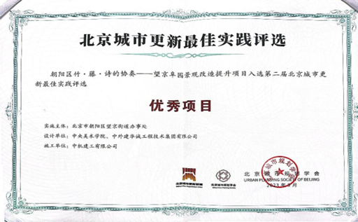 继中机建工承建的望京小街改造工程被评选为2021年度十大“北京最美街巷”后,望京阜园景观改造提升项目再次入选2023年“第二届北京城市更新最佳实践评选”,并获得“优秀项目”称号。